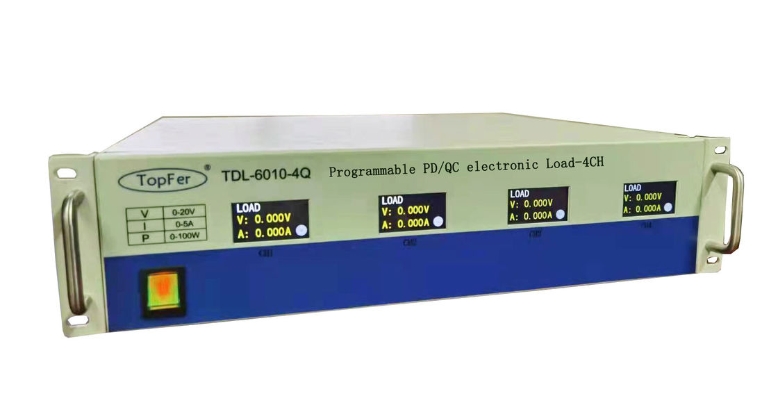 TDL-6010-4Q Programmierbare PD/QC Elektronische Belastung - 4CH und unterstützt QC, PD Protokolle. Es kann schnell zwischen Standard, QC Protokoll und PD Protokoll wechseln, mit vier unabhängigen Last-Schnittstellen.